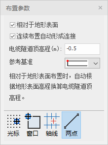 布置电缆隧道时,可以设置电缆隧道的标高,勾选相对于地形表面布置时,隧道顶部的高程一般输入负值,不勾选时,直接输入高程。布置完成的电缆隧道还可以拖拽夹点调整长度。