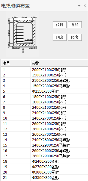 点击【预制】可以将软件预存的电缆隧道截面添加到对话框中。