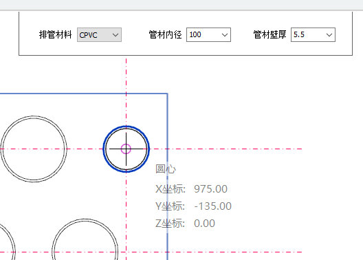 点击【添加管】,弹出抬头栏,设定管信息后,在图面中点击鼠标左键布置管,如下图: