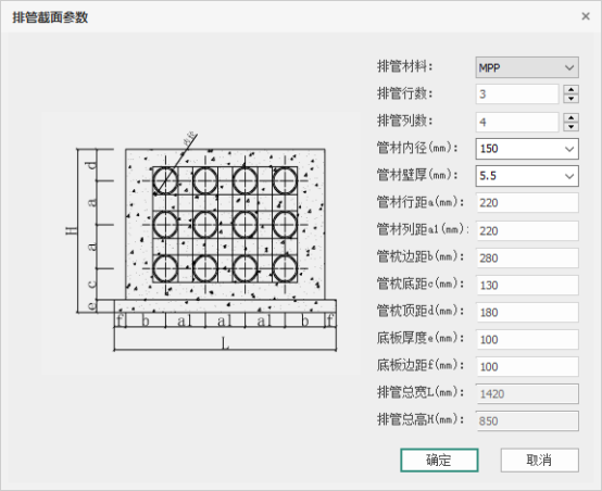 排管总宽L/总高H:排管截面根据上述参数计算出的总宽/总高,供用户参考,不可人工输入修改。