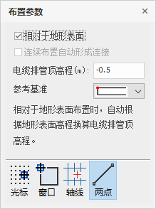 布置电缆排管时,可以设置电缆排管的标高,勾选相对于地形表面布置时,排管顶部的高程一般输入负值,不勾选时,直接输入高程。布置完成的电缆排管还可以拖拽夹点调整长度。