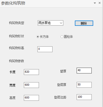 (2)在弹出的参数面板中,对构筑物的参数进行设置(参数单位为mm)。参数界面如下: