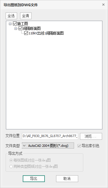 (2)选择导出内容,勾选导出列表中的图纸节点,确定导出范围。