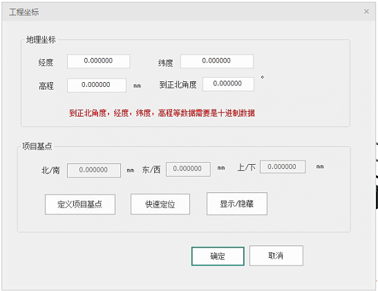(2)输入工程地理坐标:坐标系应使用2000国家大地坐标系,高层采用1985国家高层基准,输入数据均需要十进制的数据;