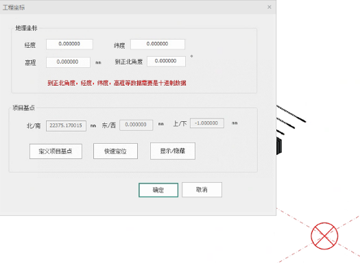 (3)定义项目基点:点击按钮【定义项目基点】在场景中自由切换捕捉选择待指定的设计原点,右键确定,界面中将选择的改点的XYZ坐标写入界面中,且不可修改;