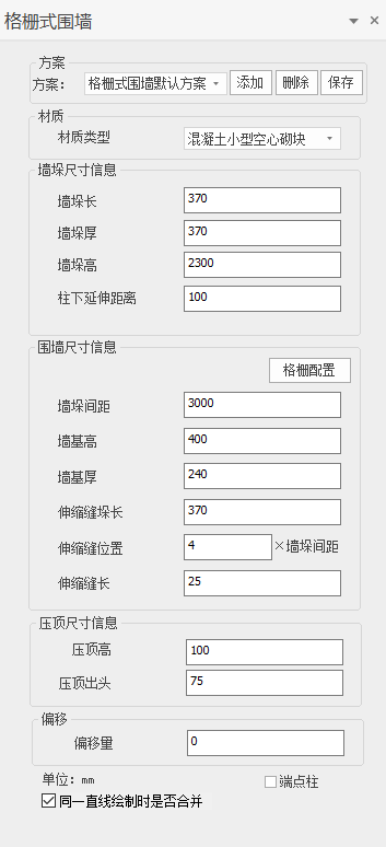 通过输入,设定围墙高、厚、伸缩缝位置、伸缩缝位置的墙垛长及伸缩缝的长度等参数。