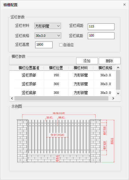 设定格栅竖栏与横栏的材料、规格、间距等参数;详见预览图。