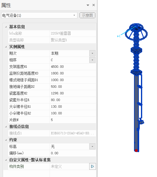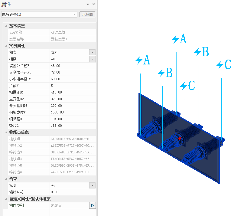 避雷器、穿墙套管和支柱绝缘子布置后,支持属性栏修改参数驱动模型外观。