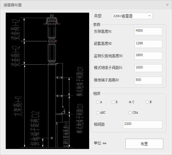 (1)选择需要布置的避雷器类型,支持10kV~500kV避雷器;