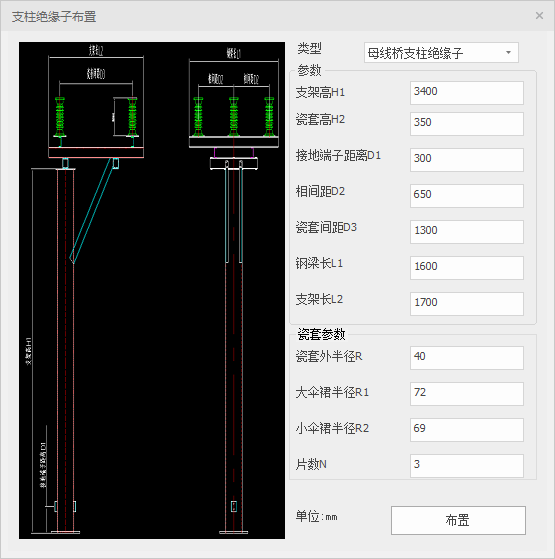 (1)选择需要布置的支柱绝缘子类型,支持单相、三相和母线桥支柱绝缘子;