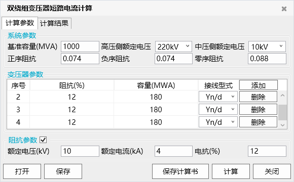 (2)操作同6.4.1.1三绕组变压器短路计算。