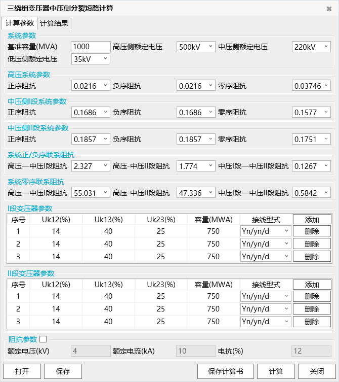 用于计算三绕组变压器中压侧分裂短路工况下的短路电流。