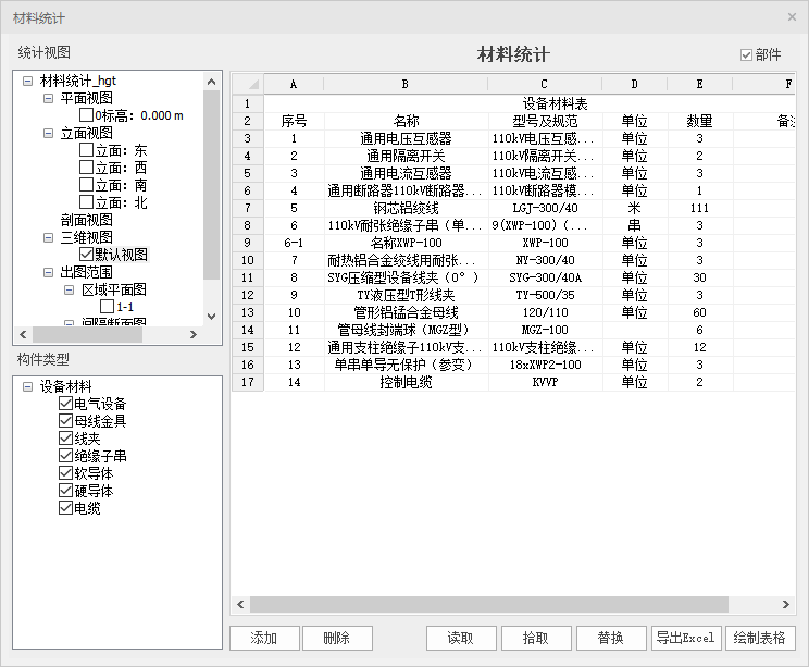 材料统计可实现选择视图和构件类型确定统计范围,完成电气材料一键统计。
