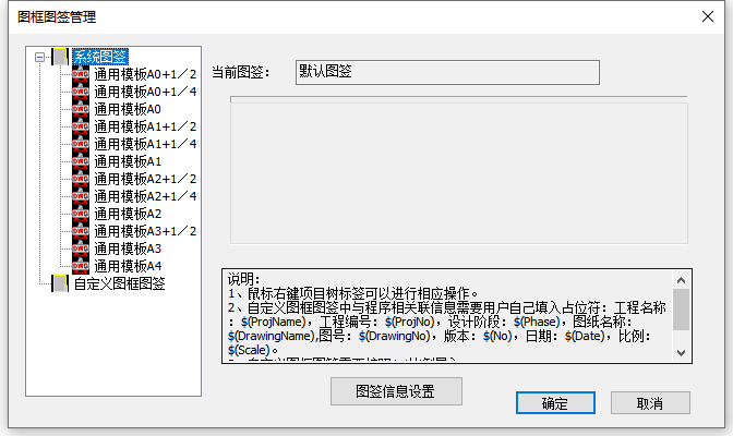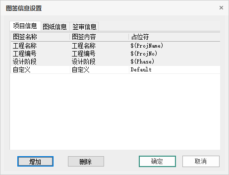 3)图签信息设置,在图签信息设置界面,可自定义添加图签上的“项目信息”和“图纸信息”