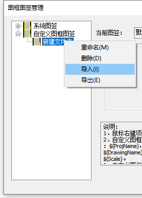2)导入本地图框图签,右键自定义图框图签下新建的目录,选择导入,将本地的图框图签DWG文件导入。