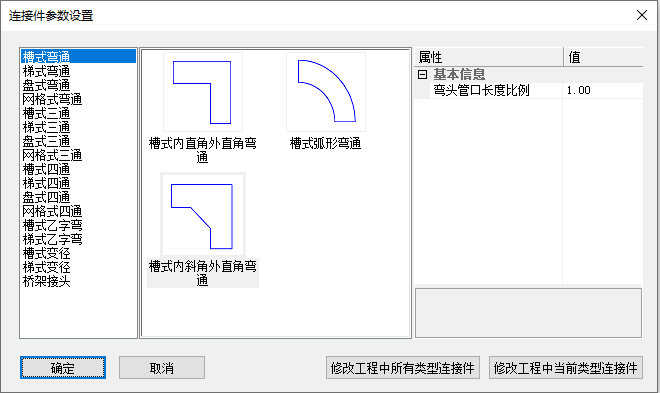 桥架连接件设置用来定义桥架连接管件(弯头、三通、四通等)的默认参数。