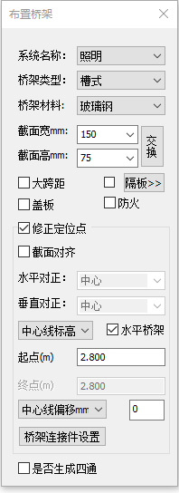 桥架布置界面如图所示,在界面中可对系统类型、桥架类型、桥架尺寸进行设置和修改。同时可以设置桥架布置标高、桥架偏心距离和桥架角度等绘制参数。管件设置可以设置默认的桥架连接件。
