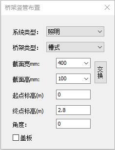 竖直桥架界面如图表所示,角度指桥架相对X轴旋转角度。确定参数后,点取布置点完成布置。