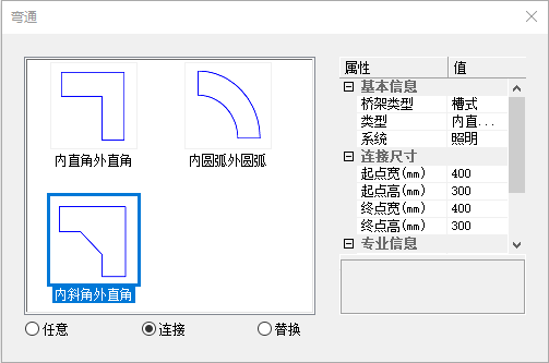 [连接] 依次点取第一段桥架和第二段桥架,鼠标右键完成弯头连接。弯头与桥架断面参数自动取与之相连的桥架断面参数。