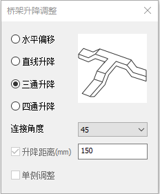 使用桥架升降调整命令,可以在俯视图完成桥架上下翻避让调整。操作步骤如下:选择调整方式,点取需要调整的桥架位置,自动生成连接件,如图所示。