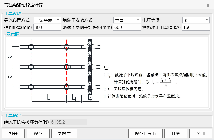 (1)在计算校核菜单栏下,点击“高压电瓷动稳定计算”功能按钮,激活命令,视口弹出以下对话框: