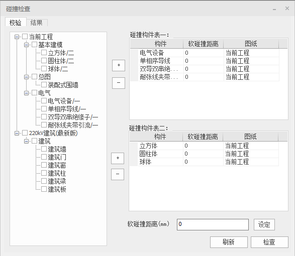 2.点击+或-按钮,在碰撞构件列表一和碰撞构件列表二中,添加构件类别。