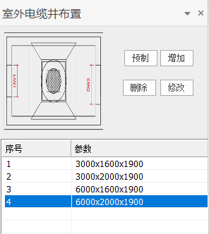 点击“电缆井布置”实现电缆井构件的交互布置,“室外电缆井布置”对话框中会列出了已经进行定义的电缆井截面,如下图: