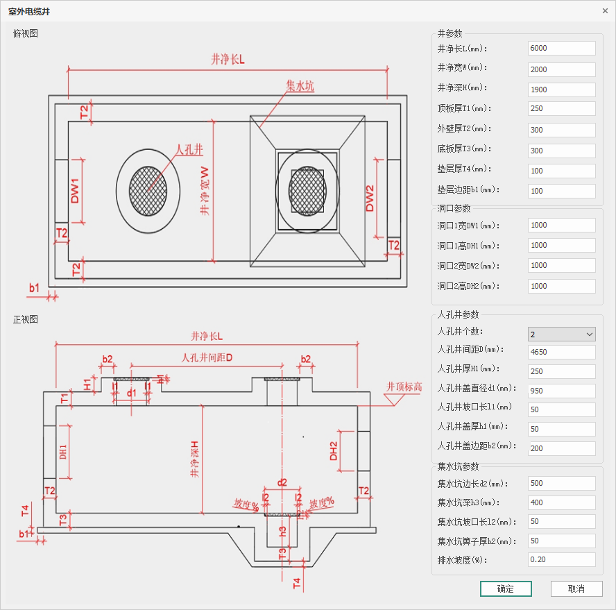 - 人孔井个数:个数分为1或2个;1个时人孔井在电缆井中心位置;2个时根据人孔井间距设置确定人孔井位置。集水坑与右侧人孔井保持中心对齐。