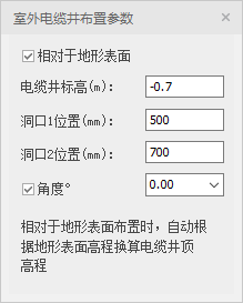 - 角度:布置电缆井的角度;勾选时,可以下拉选择或者输入角度,布置时仅需要选择定位点即可。不勾选角度布置时,点击定位点后,通过鼠标拖动选择布置角度;