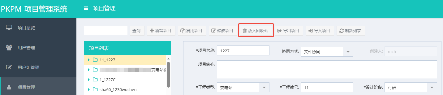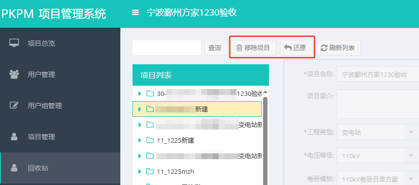 (1)放入回收站,项目管理菜单选择工程点击【放入回收站】,将工程移到回收站;
