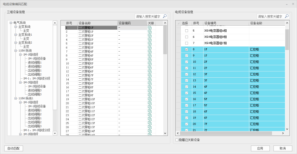(2)对话框中左侧列出当前项目的系统树以及各节点上的三维设备信息;右侧列出电缆清册中的起终点设备信息;通过勾选匹配或左下角的【自动匹配】可实现三维设备与清册起终点的关联;