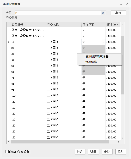 - 右键菜单:右键包含两个功能,1是将当前对话框显示的列表导出为Excel表格;2是批量修改所选设备的所在平面及偏移。