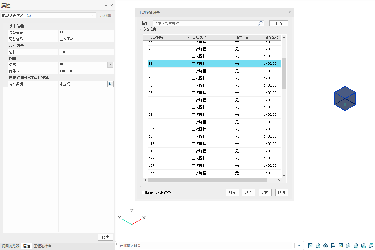 - 刷新:用于将当前列表与视图空间的数据进行同步;将已完成的设备编号用淡蓝色进行区分;若查询到项目中同一个设备编号出现多次,则给出重复次数的提示。