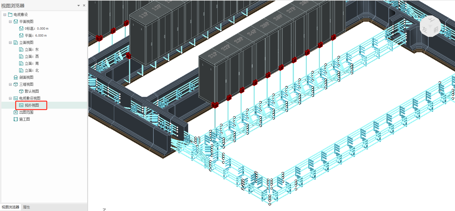 点击生成拓扑图后,软件将自动分析视图中所有的电缆通道、接线点及电缆线模型,包含链接模型,随后在视图浏览器中生成拓扑视图,如下图: