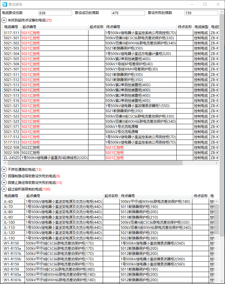 - 敷设报告:自动敷设完成后,可以查看敷设报告,报告中将列出敷设成功的根数、失败的根数及失败原因,如下图:
