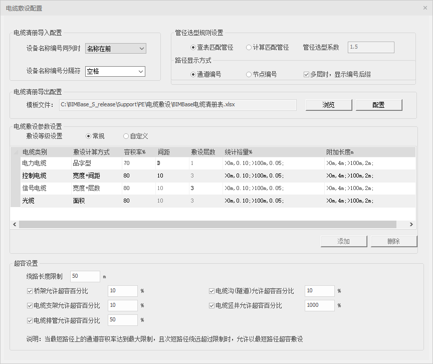 (2) 是否限制限制容积率:勾选则在敷设时考虑桥架、电缆沟、电缆排管等电缆通道的容积率。限制百分比可在【电缆敷设配置】中设置。