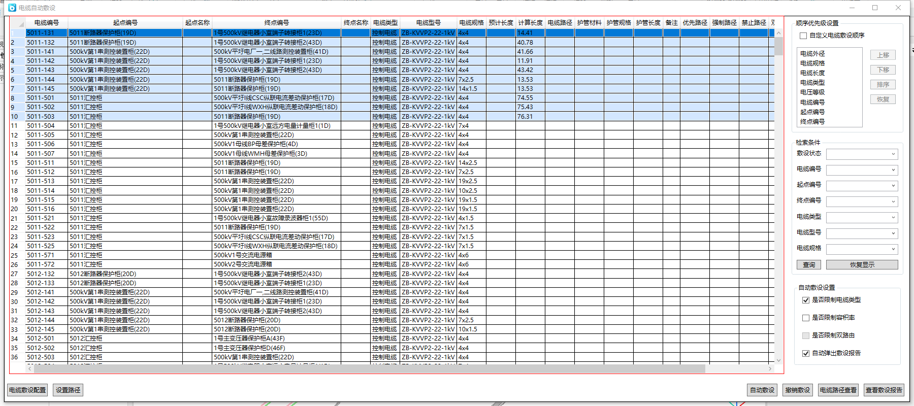 (1)顺序优先级规则包括:电缆外径、电缆规格、电缆长度、电缆类型、电缆等级、电缆编号、起点编号、终点编号。
