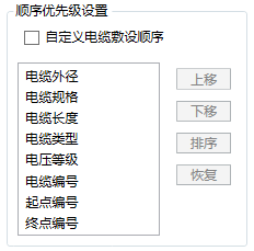 - 顺序优先级设置:用户可以通过该功能自由定义电缆敷设的先后顺序。勾选【自定义电缆敷设顺序】复选框则按照用户自定义的顺序进行敷设。