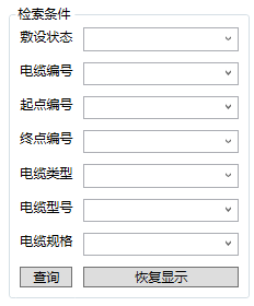- 查询:根据输入的条件查询电缆,点击【查询】按钮执行查询操作,点击【恢复显示】按钮将显示出全部电缆。