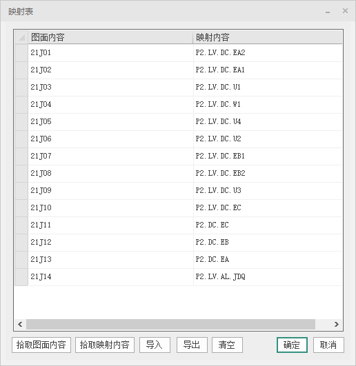 - 映射匹配:用于二次屏柜的屏位号、设备编号、名称匹配;勾选映射匹配后,可点击【映射表设置】功能,弹出如下对话框,在对话框支持拾取参照底图中的屏柜表格文字内容,设定映射内容;设定完成后,在执行【自动匹配】时,则按照映射内容,与电缆清册中的设备编号进行匹配。匹配结果预览见下图
