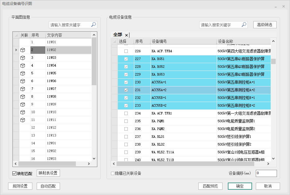 (2)对话框中左侧列出从底图中识别的文字信息;右侧列出电缆清册中的起终点设备信息;通过勾选匹配或左下角的【自动匹配】可实现文字与清册起终点的关联;