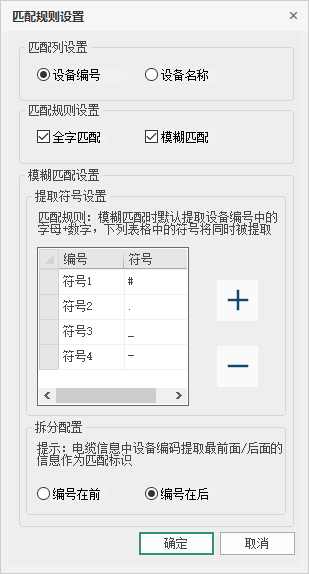 - 规则设置:点击后弹出如下图对话框,对话框中可以设定匹配列为“设备编号”或“设备名称”,可以设定全字匹配或模糊匹配;模糊匹配默认按照清册中的编号与图面内容进行匹配,可以设定同时参与匹配的特殊符号,以及编号在前或在后。