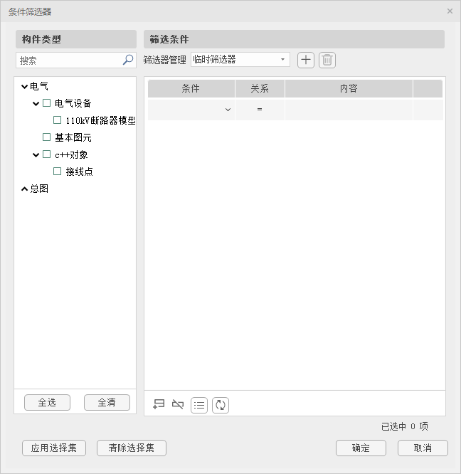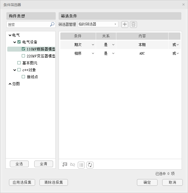 (1)选择需要筛选的构件类型,左侧显示的构件中勾选需要进行条件筛选的对象;