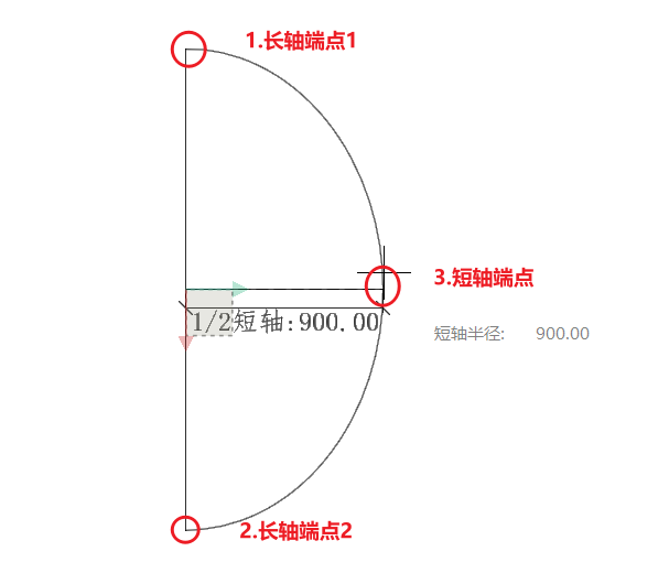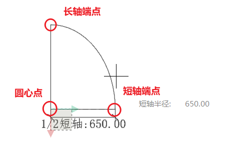 - 通过依次确定三个点,分别是长轴端点、圆心点和短轴端点的方式完成1/4椭圆的绘制;如下图3;