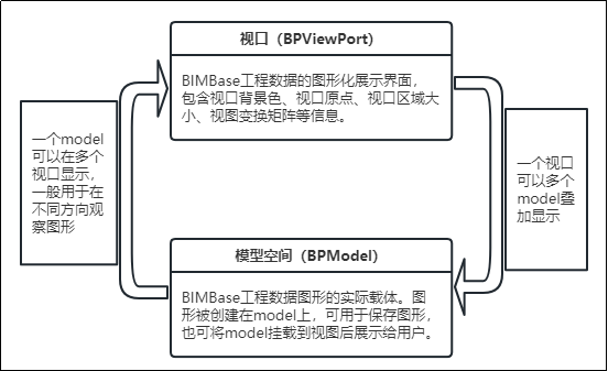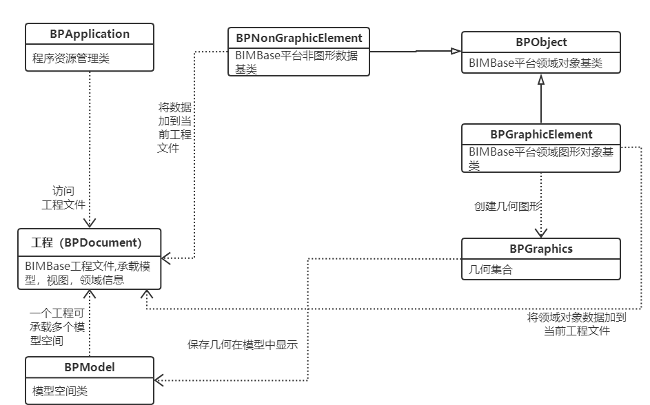 本节主要介绍BIMBase中的一些重要概念及相互关联,包括程序资源管理(BPApplication)、项目(BPDocument)、领域对象(BPObject)、几何集合(BPGraphics)、视图(BPViewPort)、模型空间(BPModel)等。