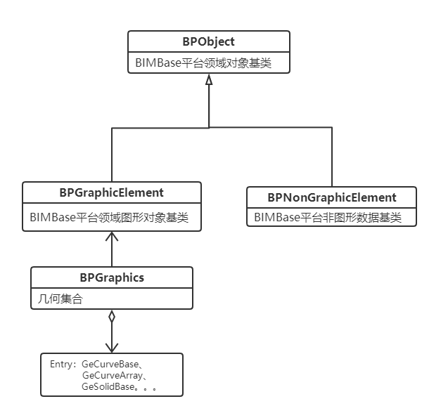 在BIMBase,领域对象(BPObject)分为图形对象(BPGraphicElement)和非图形数据(BPNonGraphicElement)。图形对象一般用于创建需要图形展示的领域对象,非图形数据一般用于保存一些辅助数据。图形对象和非图形数据都需保存数据到工程中,但是图形对象还可以利用几何集合(BPGraphics)保存后在模型空间(BPModel)上进行展示。