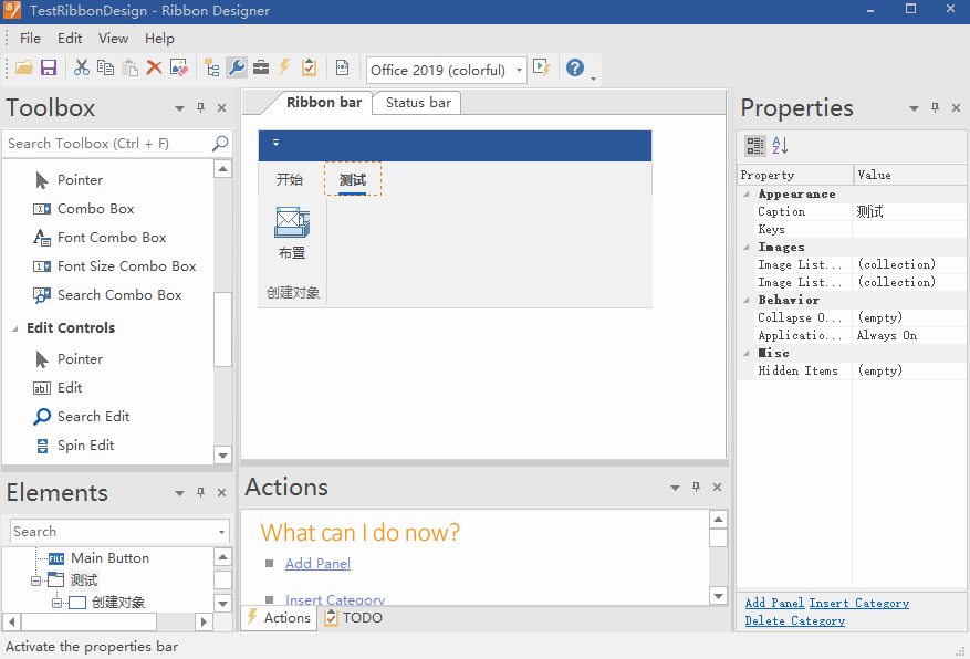 - 在编辑工具完成菜单的编辑后,保存并且重新编译TestRibbonDesign.sln,得到新的TestRibbonDesign.dll。