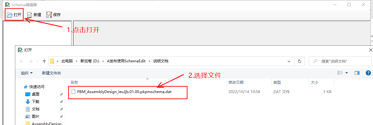 验证通过后,点击上侧功能栏的打开按钮,在弹出的对话框中选择待打开的文件,文件尾缀的格式为.pkpmschema.dat,此处打开PBM_AssemblyDesign.pkpmschema.dat文件。