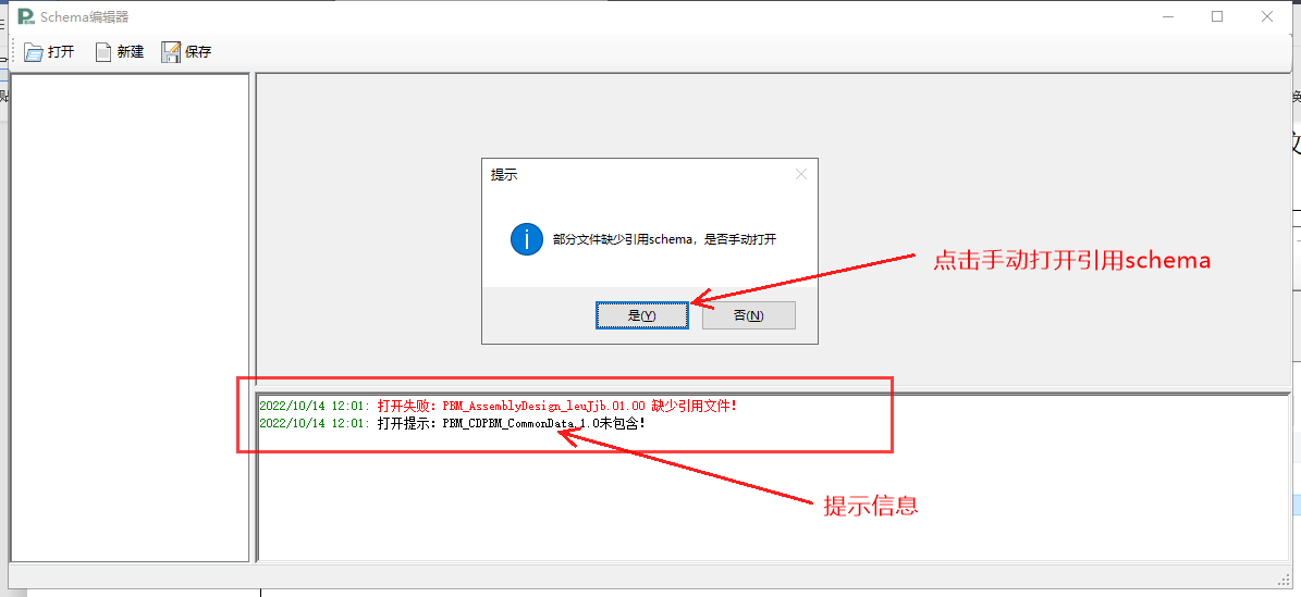 若当前的schema存在引用其他schema文件的情况,会提示缺少schema,如图11-20所示;选中被引用的schema文件所在的文件夹,正确之后,会将被引用和原来的文件一起打开,如图11-21中所示原文件PBM_AssemblyDesign_leuJjb.01.00.pkpmschema.dat和被引用文件PBM_CommonData.01.00.pkpmschema.dat都被打开。