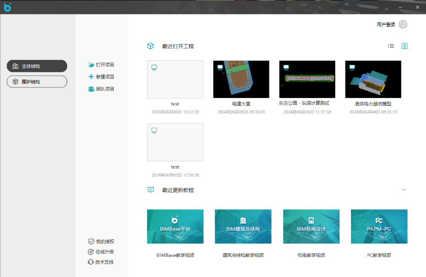 程序启动界面如图 1.2-1所示,用户将启动环境选为【主体结构】,并可根据需要,点击【打开项目】或【新建项目】开始设计操作,程序保存文件格式为.P3D: